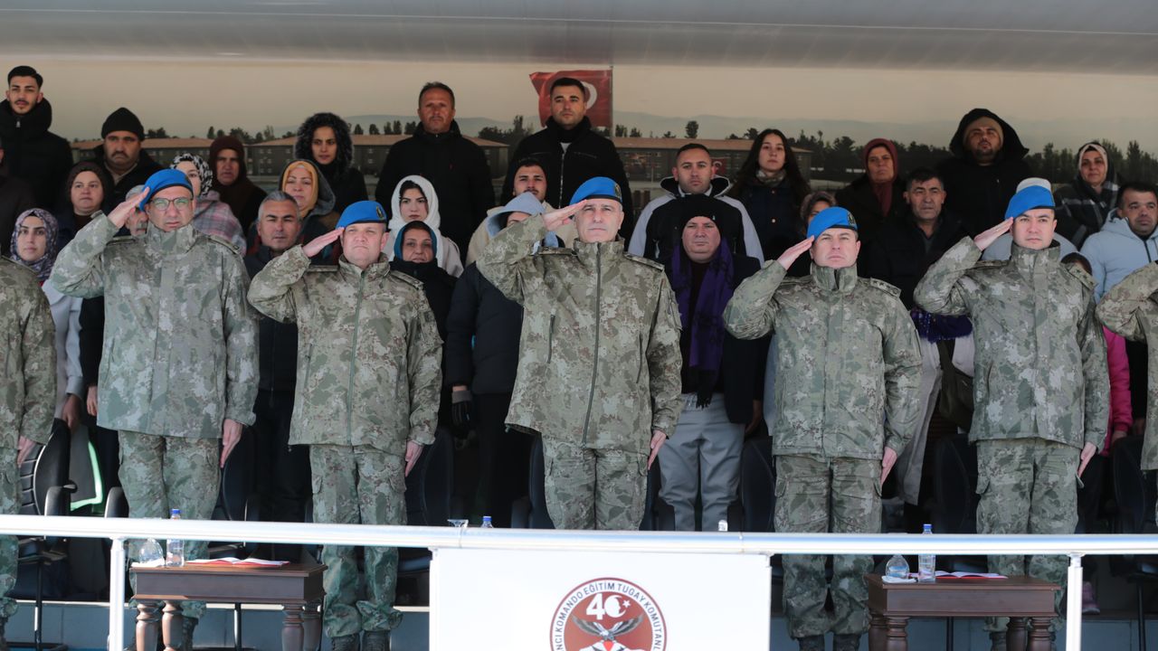 40'ıncı Komando Eğitim Tugay Komutanlığı'nda 2025-2-5'inci dönem uzman erbaş, 2025-9'uncu dönem statü geçişi uzman erbaş ve 76'ncı dönem sözleşmeli erler için gerçekleştirilen mezuniyet törenine Tugay Komutanı Tuğgeneral Merdin Kışkan ile askerlerin aileleri katıldı.