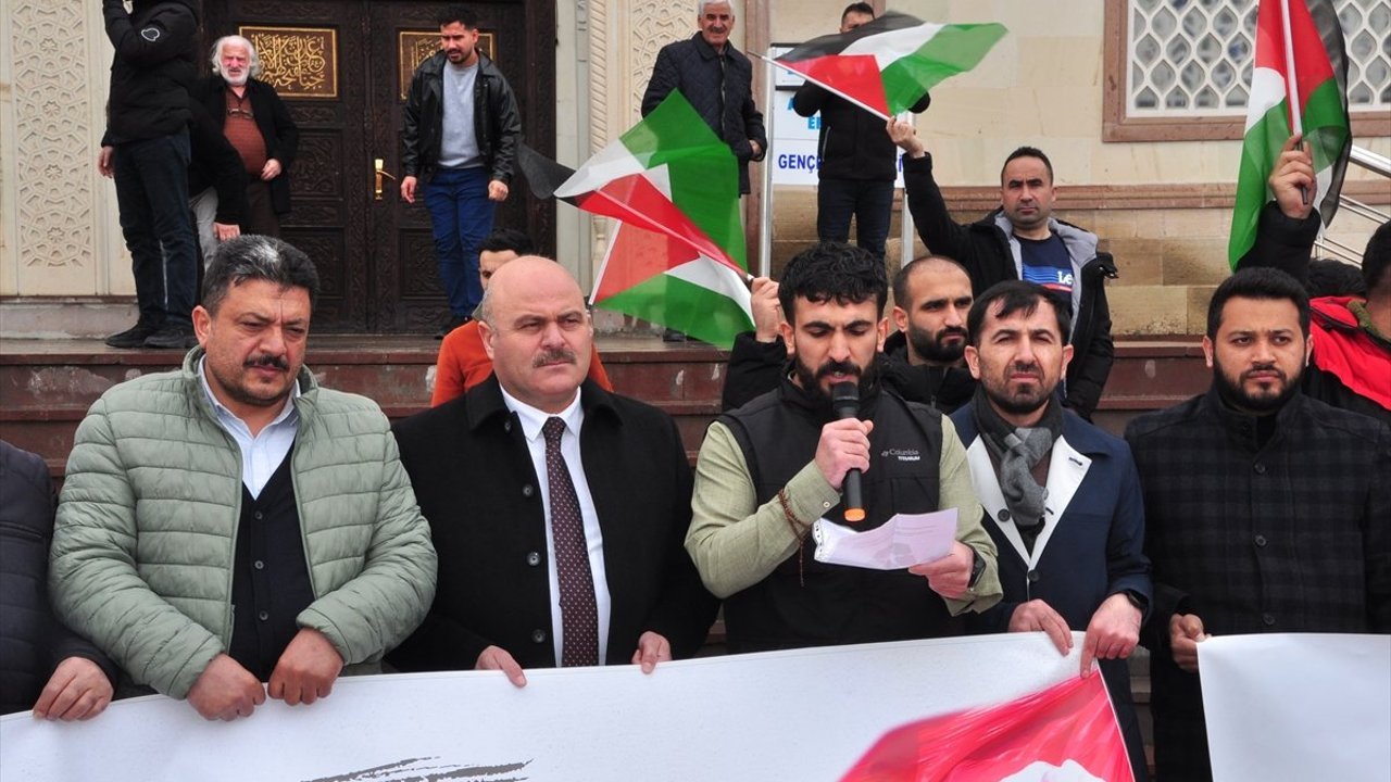 Filistin'e Destek Platformunun çağrısı üzerine Davud-i Karsi Camisi önünde toplanan vatandaşlar, Filistin ve Türk bayrakları taşıyarak İsrail aleyhine slogan attı.
