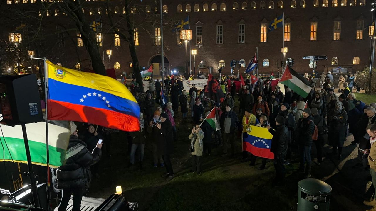 İsveç Kralı 16. Carl Gustaf tarafından Nobel yemeğinin verildiği Stockholm Belediye binasının önünde toplanan göstericiler, ABD, İsrail ve İsveç aleyhine İsveççe ve İngilizce 'Gazze'de soykırımı durdurun' ve 'Venezuela'ya dokunma' sloganları attı.