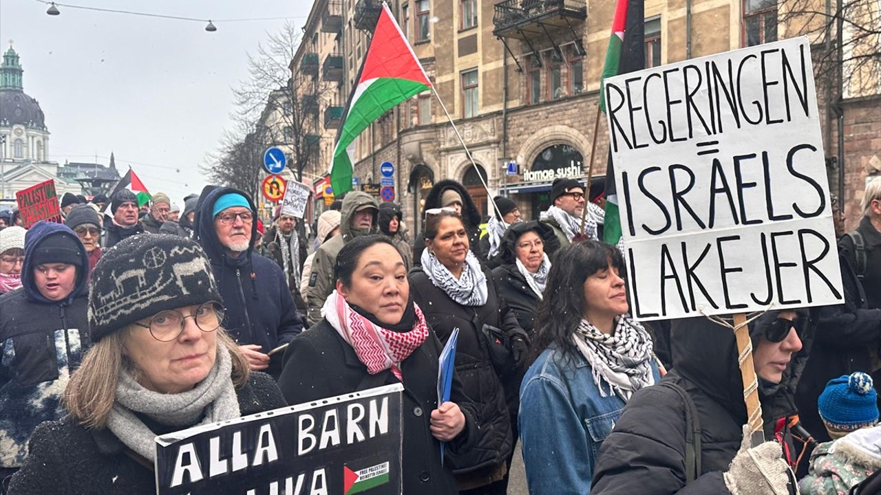 Eylemde, 'Gazze'de çocuklar öldürülüyor', 'Soykırımı durdurun' ve 'Sonsuza kadar Filistin' yazılı pankartlar taşıyan göstericiler İsveç Parlamentosu ve Dışişleri Bakanlığı binalarının önlerine kadar yürüdü.