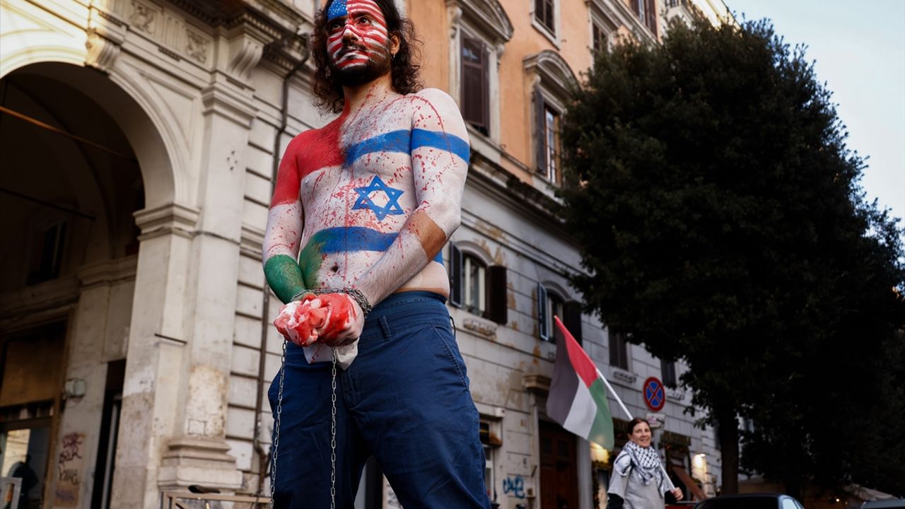 Bir göstericinin, yüzünü ve bedenini ABD, İsrail ve İtalya bayrağı şeklinde boyayıp üzerinde kanlı el izleri bulunması dikkati çekti.
