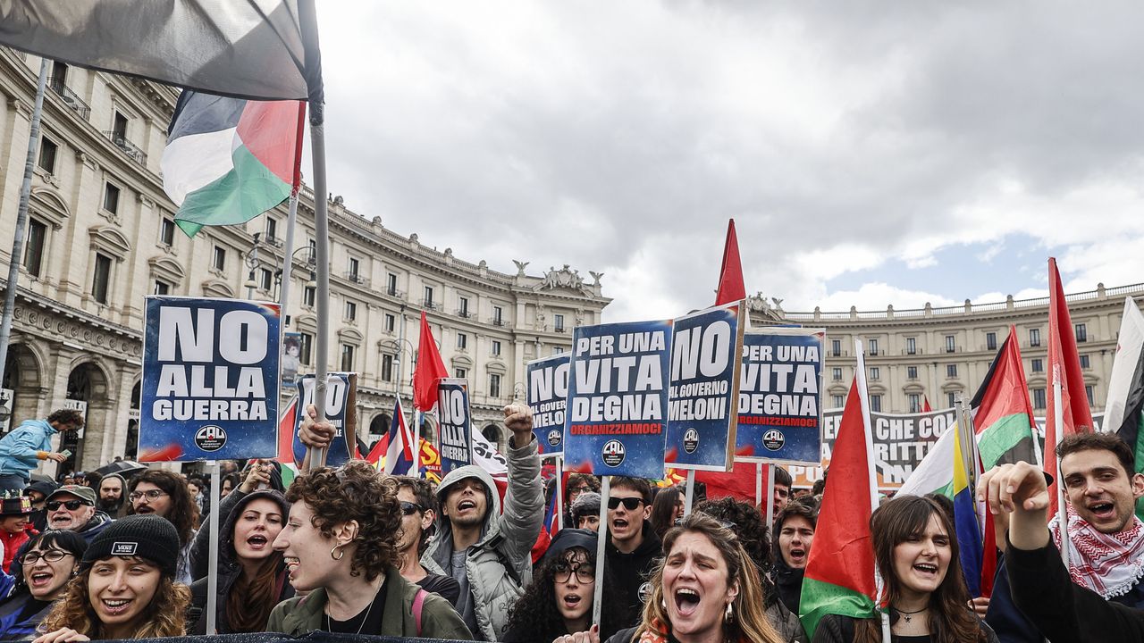 Göstericiler, Filistin, Küba, İran bayrakları ile 'Savaşa hayır', 'Yargı reformuna hayır', 'Referandumda hayır', 'İtalya'nın savaşa girmesine hayır', 'Daha kötü bir İtalya'ya hayır', 'Meloni hükümetine hayır', 'Küba'dan ellerinizi çekin' ve 'İran'dan ellerinizi çekin' yazılı pankart ve dövizlerle yürüdü.