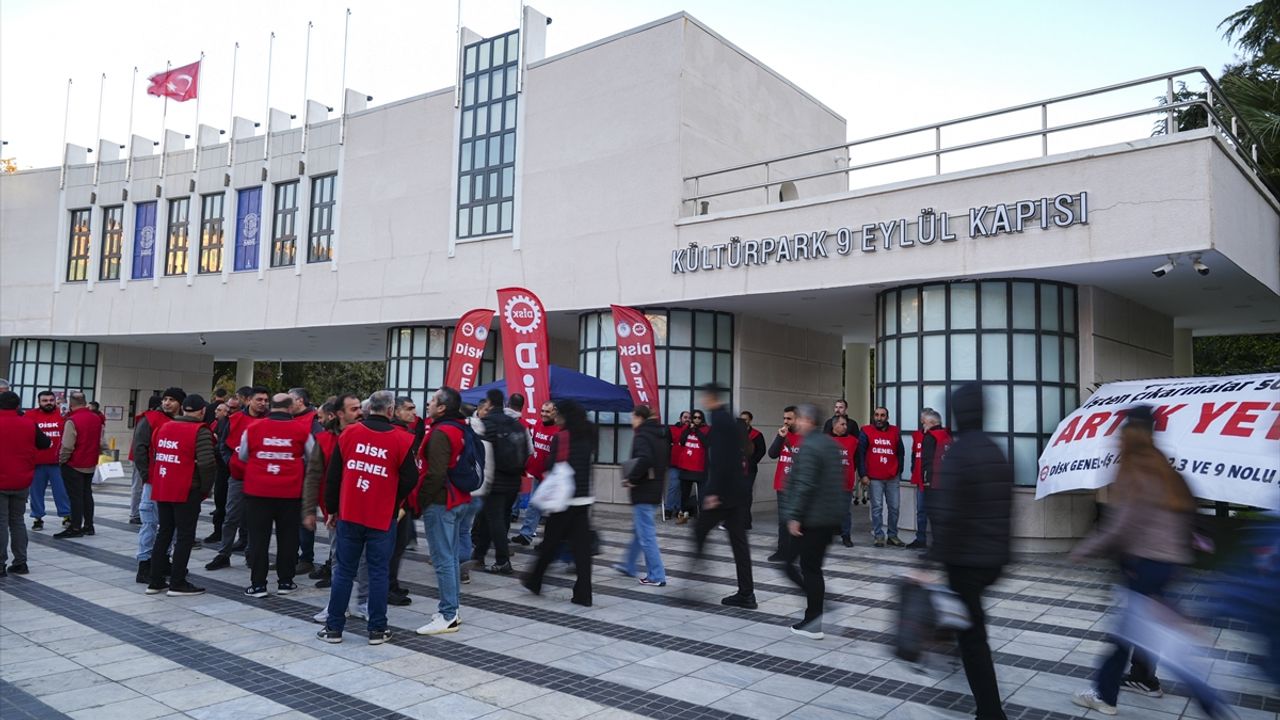 Genel-İş Sendikası üyesi işçiler ve sendika temsilcileri, Kültürpark 9 Eylül Kapısı önünde bir araya geldi, çeşitli sloganlar attı.