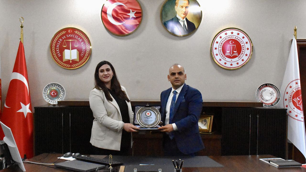 Van Cumhuriyet Başsavcısı Osman Kara, LÖSEV ve Çocuk Evleri Sitesi gibi önemli kurumlara bağış yapılmasını sağlayan adliye personeli uzlaştırmacı Gülbahar Çelik Kaya'ya plaket takdim etti.