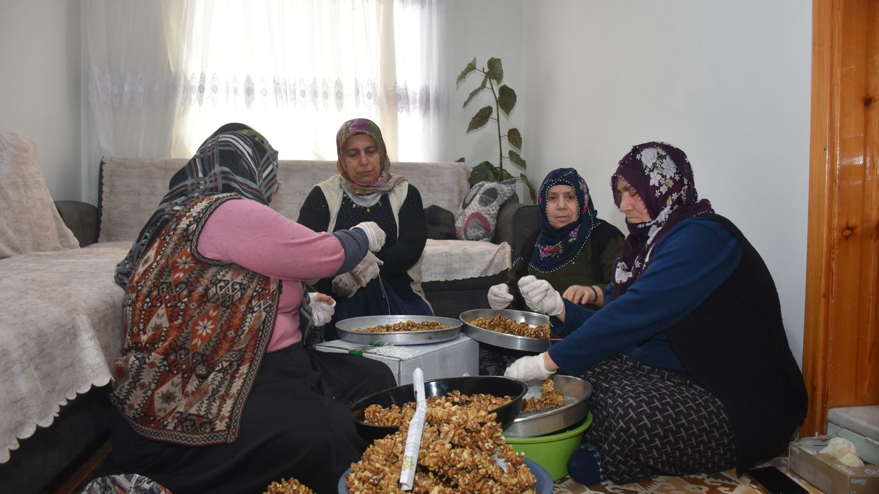 Kentteki pestil ve köme üreticilerinden koliler halinde ceviz temin eden kadınlar, cevizleri iğne ve ip yardımıyla tek tek dizerek hazırlıyor.