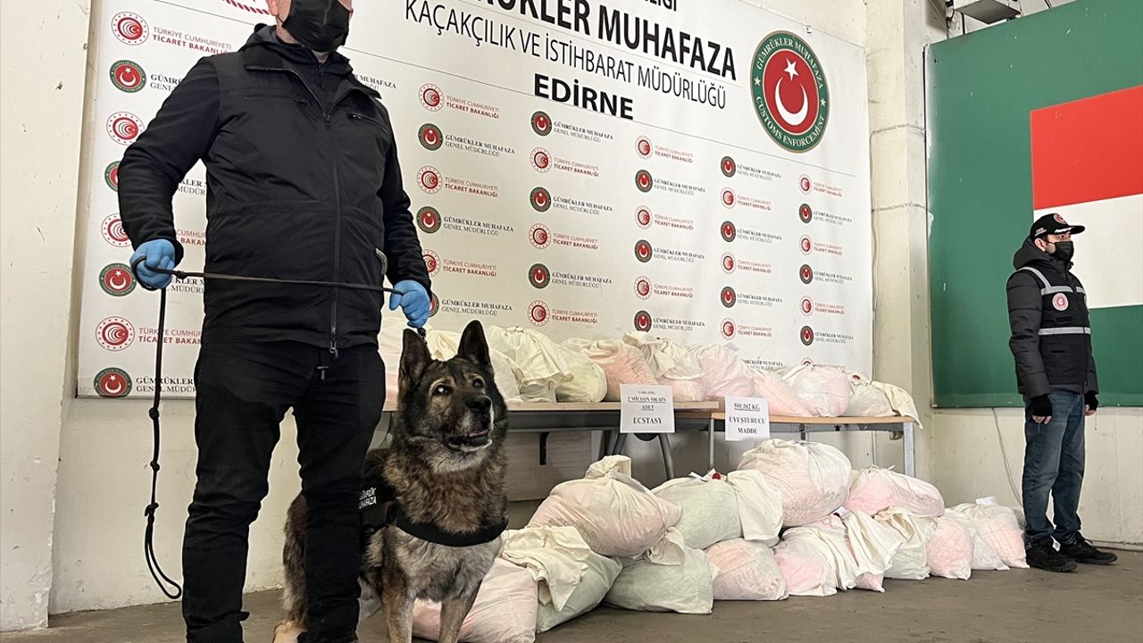 Edirne Gümrük Muhafaza ekipleri, yoğunluk tespit edilen tırın dorsesinde narkotik dedektör köpeği 'Bodri' ile arama yaptı.