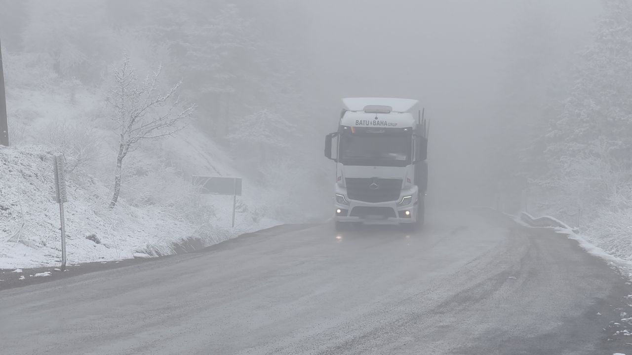 Ahmetusta Geçidi mevkisinde sürücüler, sis nedeniyle görüş mesafesinin azaldığı güzergahta dikkatli seyrediyor.