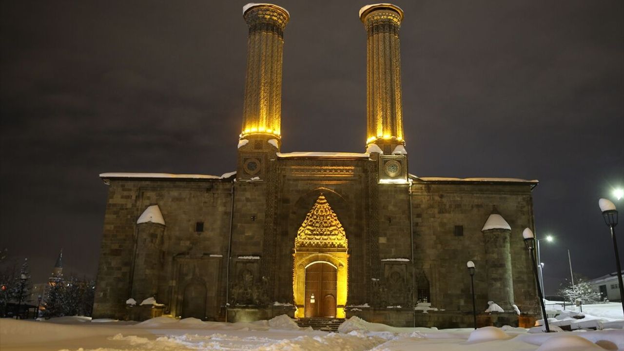 Tarihi Çifte Minareli Medrese, Erzurum Kalesi, Yakutiye Medresesi ve Tepsi Minareli Saat Kulesi ile çevresi beyaz örtüyle kaplandı.