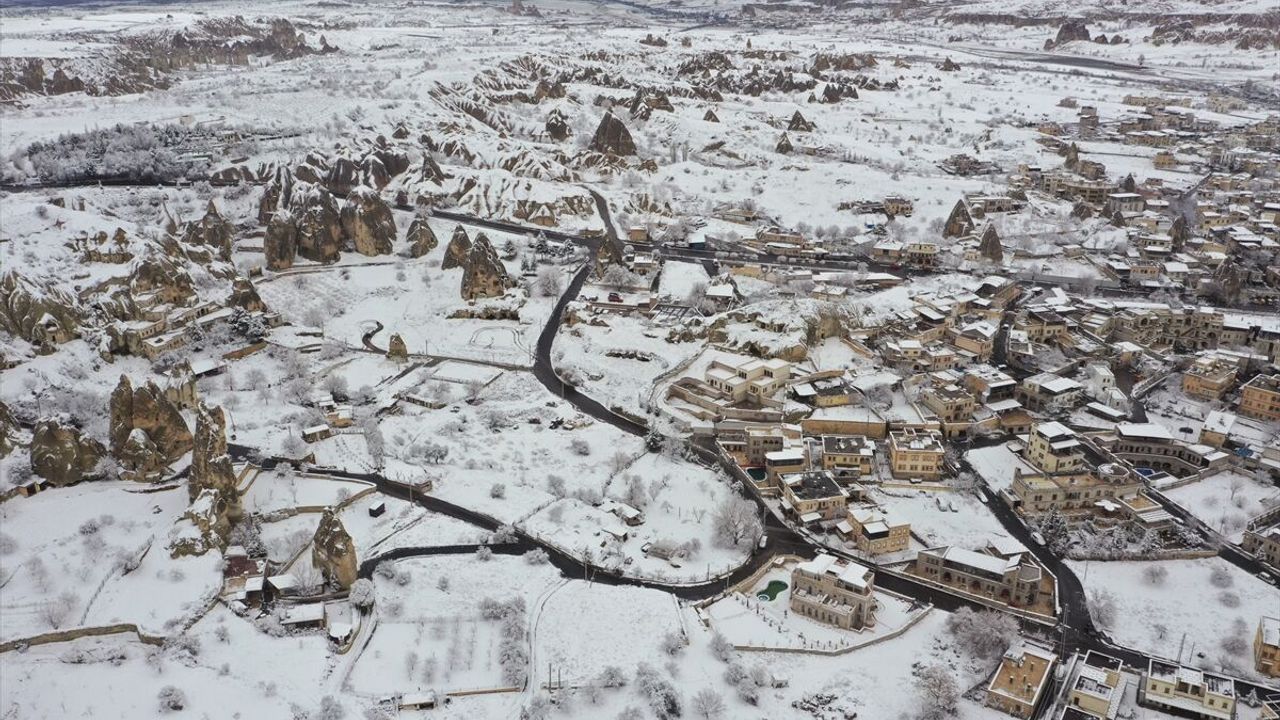 UNESCO Dünya Mirası Listesi'nde yer alan bölgede, turistlerin uğrak noktalarından Göreme, Uçhisar ve Ortahisar beldelerindeki peribacaları ile doğal kaya oluşumları, kar altında farklı bir manzaraya büründü.
