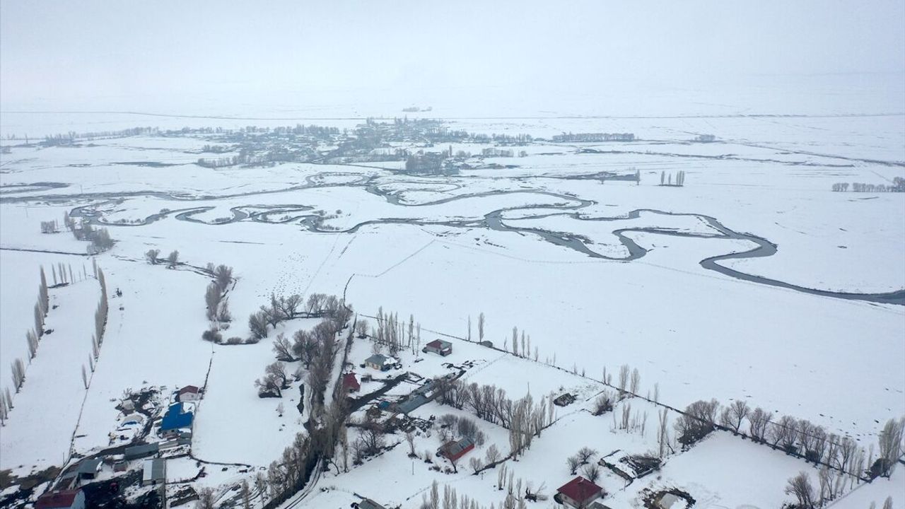 KARS (AA) - Kars'ın Arpaçay ilçesinde kıvrım kıvrım akan Telek Suyu'nun karla kaplı hali dronla görüntülendi.