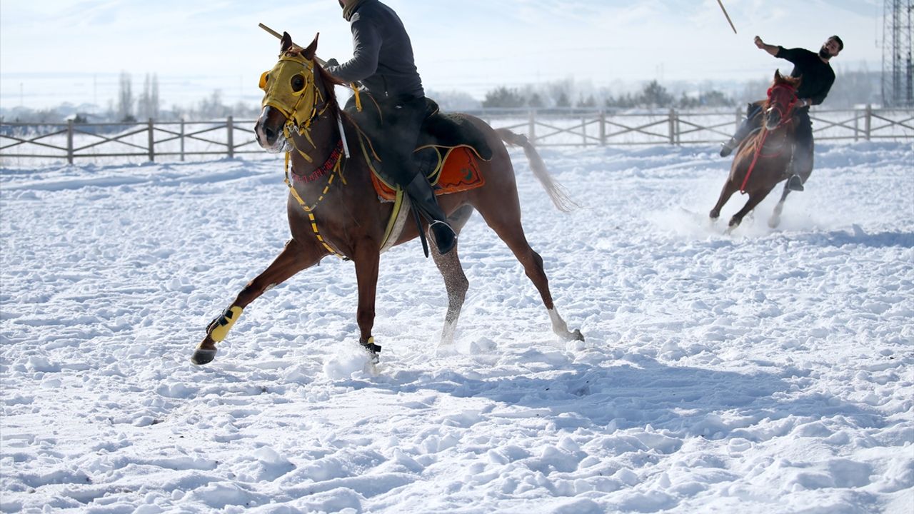 Sabah erken saatlerde atlarını ahırdan çıkarıp gerekli hazırlıkları yaptıktan sonra Selim Ata Sporları Turizm Destinasyon Merkezi'nde bir araya gelen cirit tutkunları, kar üzerinde atlarını sahaya sürüyor.