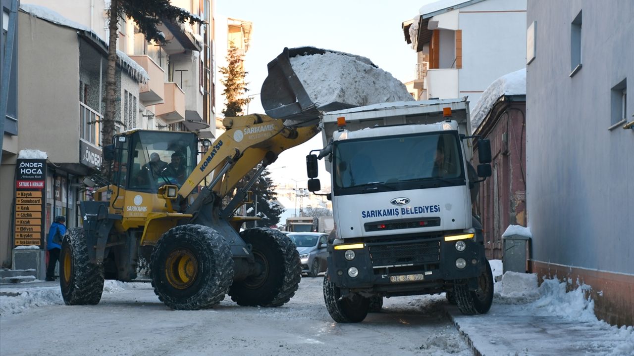 Sarıkamış Belediyesi Fen İşleri Müdürlüğüne bağlı 6 kamyon, 2 greyder, 2 kepçe ve 20 personelle başlatılan çalışmayla, çarşı içindeki cadde ve kaldırımlarda oluşan kar ve buz kütleri kamyonlara yüklenerek şehir dışına taşınıyor.