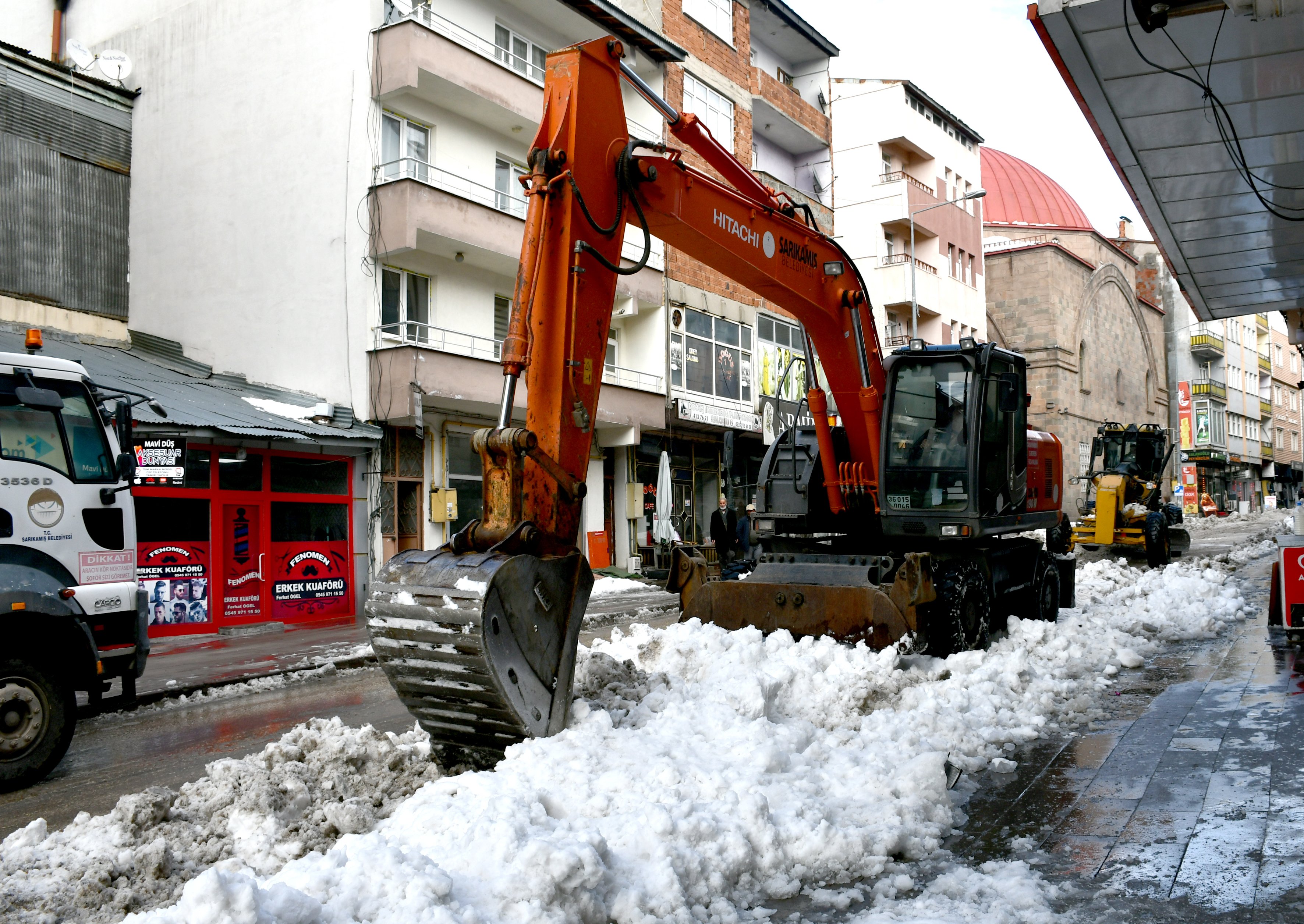 Sarıkamış Belediyesi ekipleri de caddelerdeki kar kütlelerini temizleyip şehir dışına taşıyor.