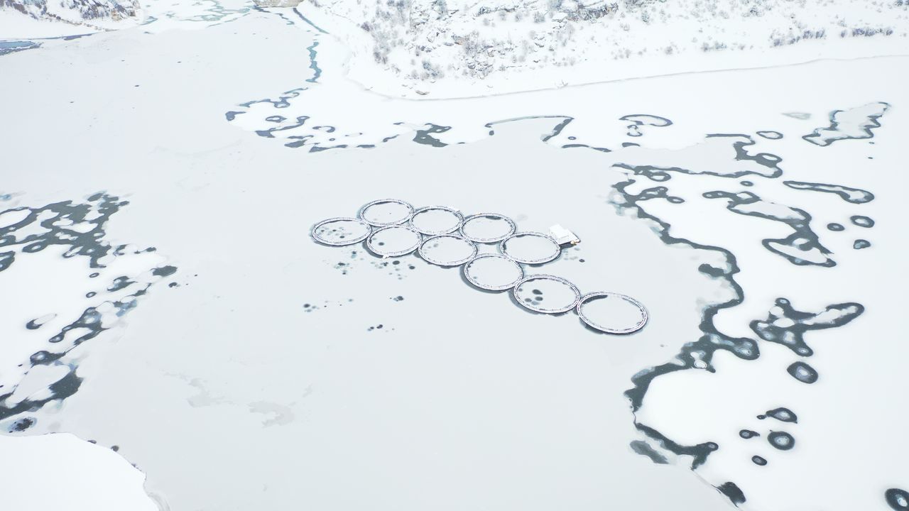 Güzel görüntünün oluştuğu buzla kaplı baraj, dronla görüntülendi.