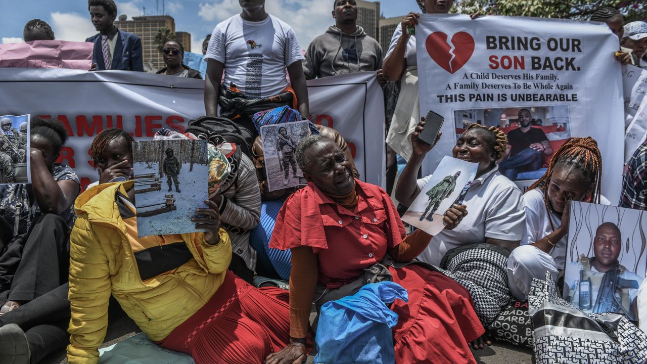 Yaralanan, kayıp veya hayatını kaybetmiş oğullarının fotoğraflarını taşıyan aileler, 'Kenyalılar ve aileleri, Rusya ordusuna alınan oğullarının adaletini istiyor.' yazılı pankartlar taşıdı.