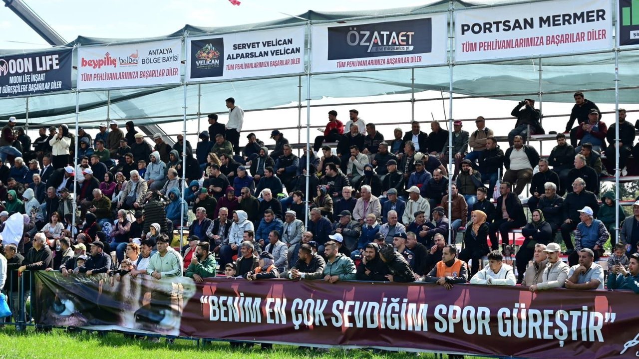 Kepez'de 12 yıl aradan sonra yeniden düzenlenen güreşlere katılan pehlivanlar, dualı çayıra 'Öğretmenlerimize ve öğrencilerimize yönelik şiddet, geleceğimize ihanettir' pankartıyla çıktı.
