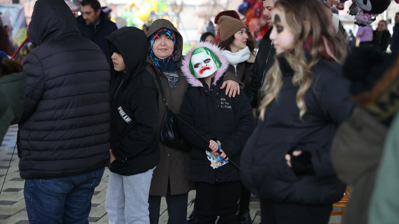 Kurulan stantlarda yüzlerini boyayan katılımcılar maskeyle beyaz ve kırmızı pelerin taktı.