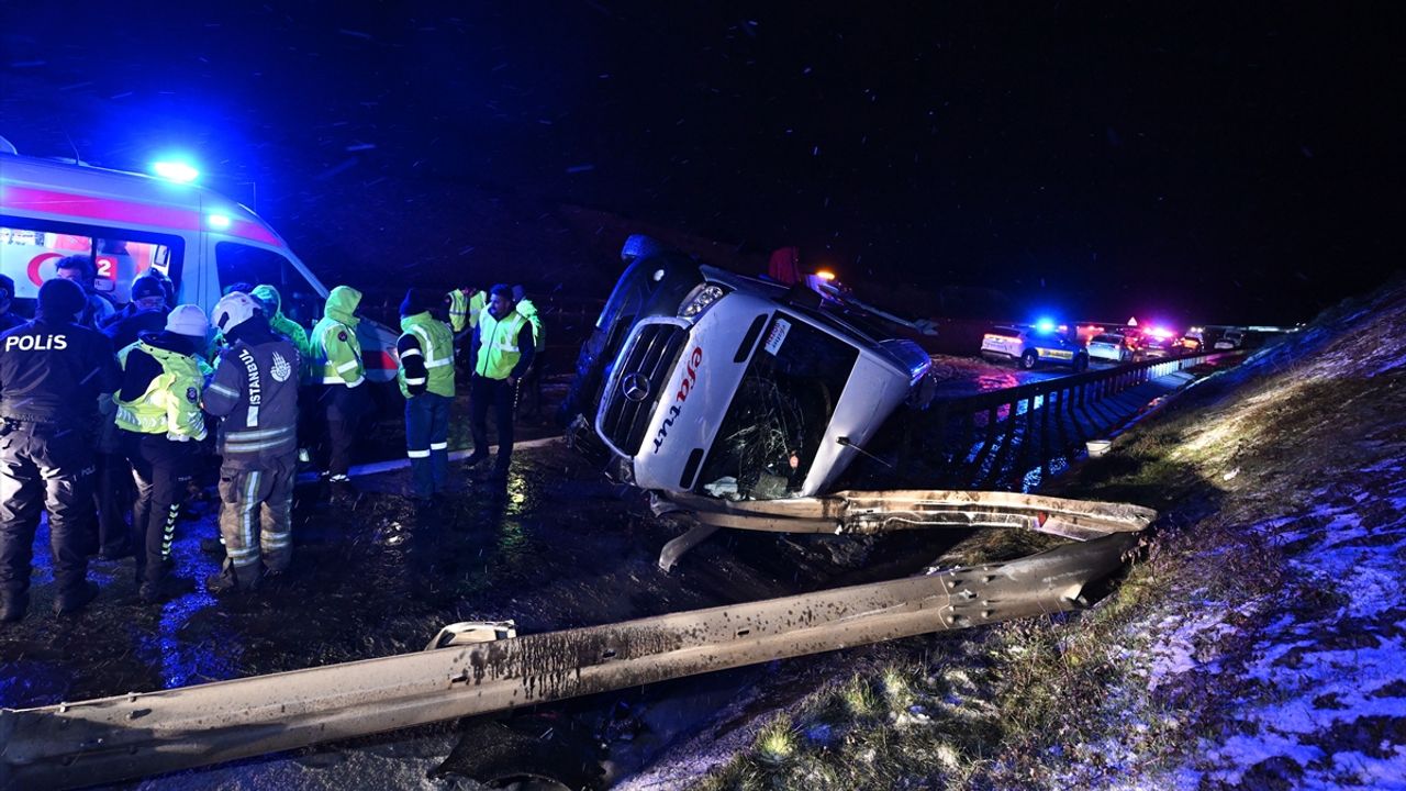 Kuzey Çevre Otoyolu Boğazköy İstiklal mevkisinde İstanbul Havalimanı istikametine seyir halindeki F.S. idaresindeki 34 LPT 868 plakalı servis minibüsü kar yağışı sonrası kayganlaşan yolda kontrolden çıkıp bariyerlere çarparak devrildi.