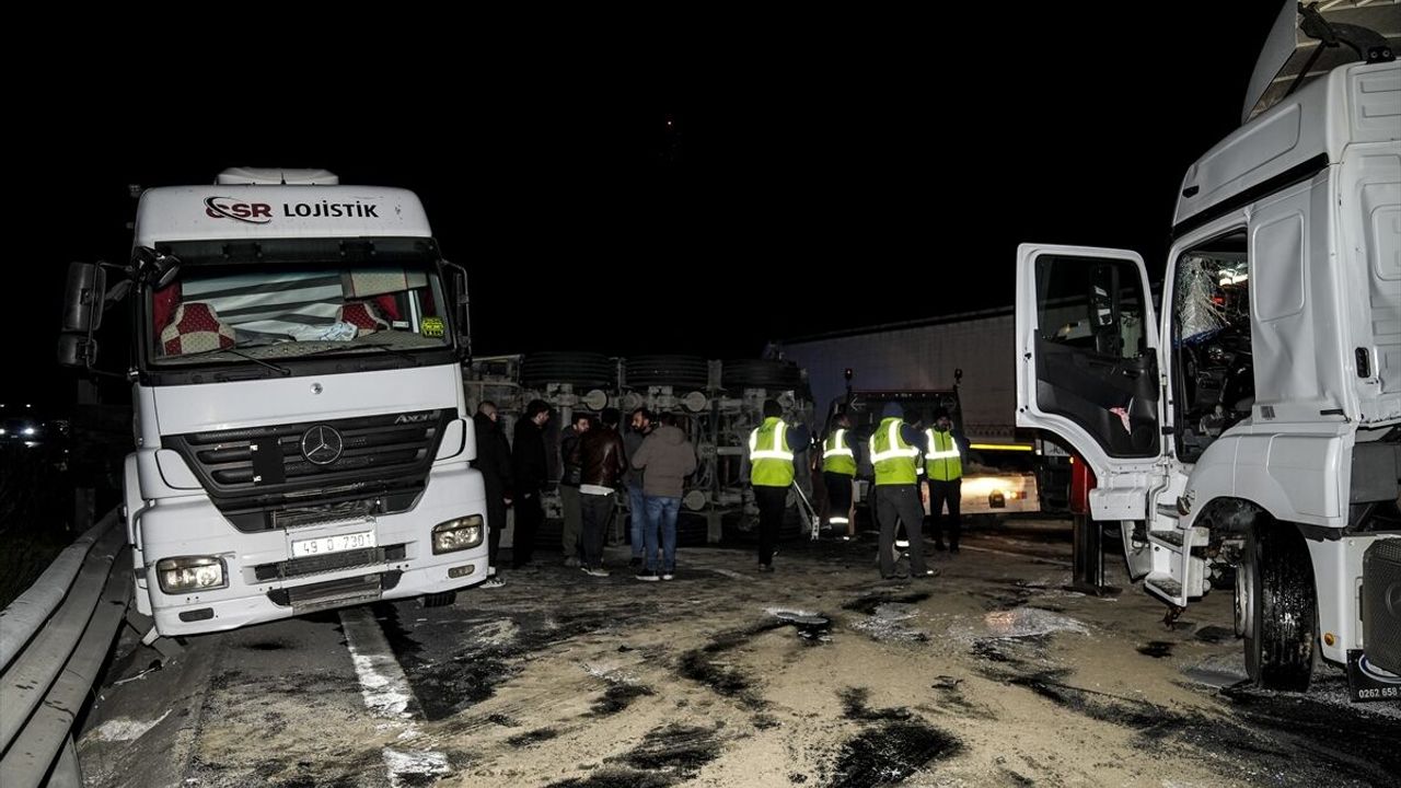 Çarpmanın etkisiyle savrulan tırlardan birinin dorsesi yola devrilirken diğer tır bariyerlere çarparak durdu.