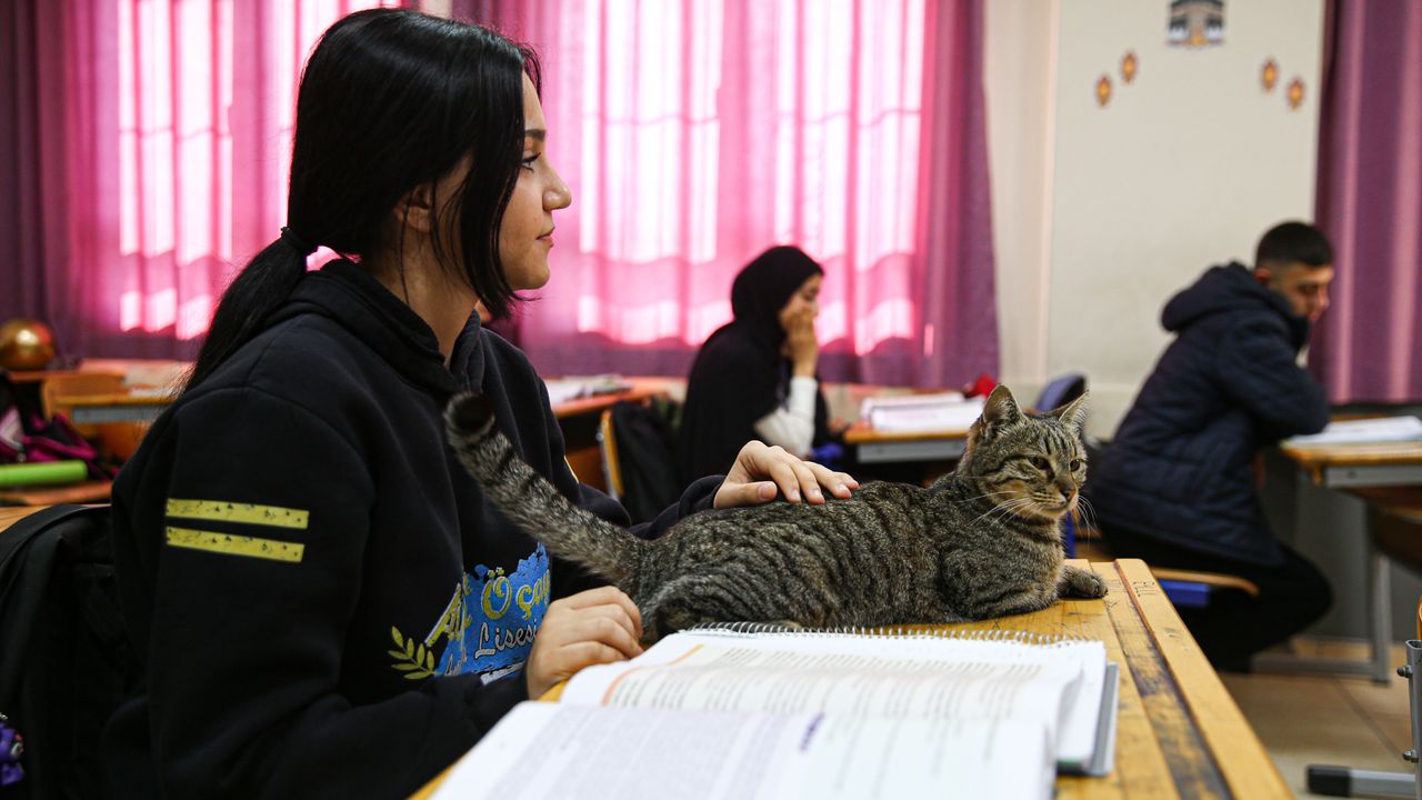 'Pakize' adı verilen kedi, zamanla okulun dersliklerinde dolaşıp teneffüslerde öğrencilerle oynar hale geldi.