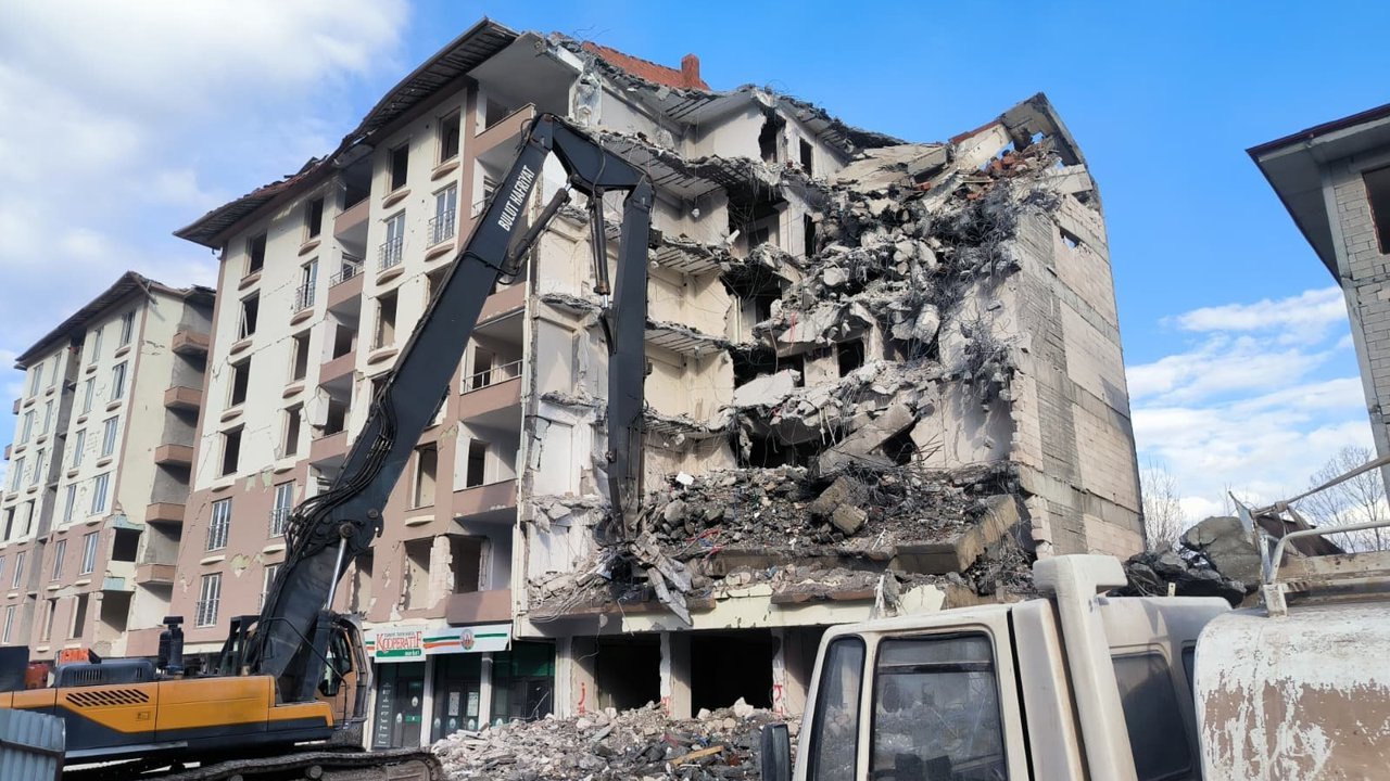 İlçede ağır hasarlı raporu verilen ancak mülkiyet sahiplerinin yürütmeyi durdurma talebiyle yargıya taşıdığı binalarla ilgili hukuki süreçlerin tamamlanmasının ardından yıkım ve enkaz kaldırma çalışmaları sürüyor.
