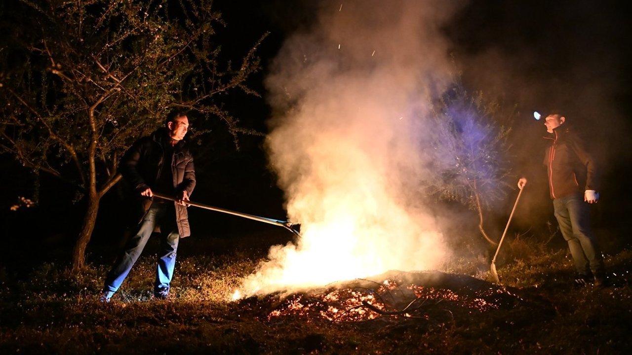 Çiftçiler akşam başlattıkları dumanlama çalışmalarını sabahın ilk saatlerine kadar sürdürüyor.