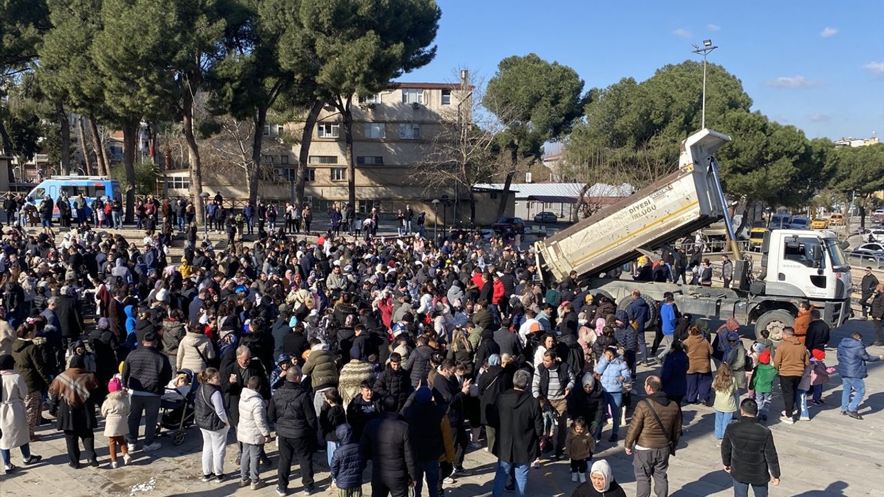 MANİSA (AA) - Manisa'nın Alaşehir ilçesinde çocuklar, kamyonlarla ilçe merkezine getirilen karla doyasıya eğlendi.