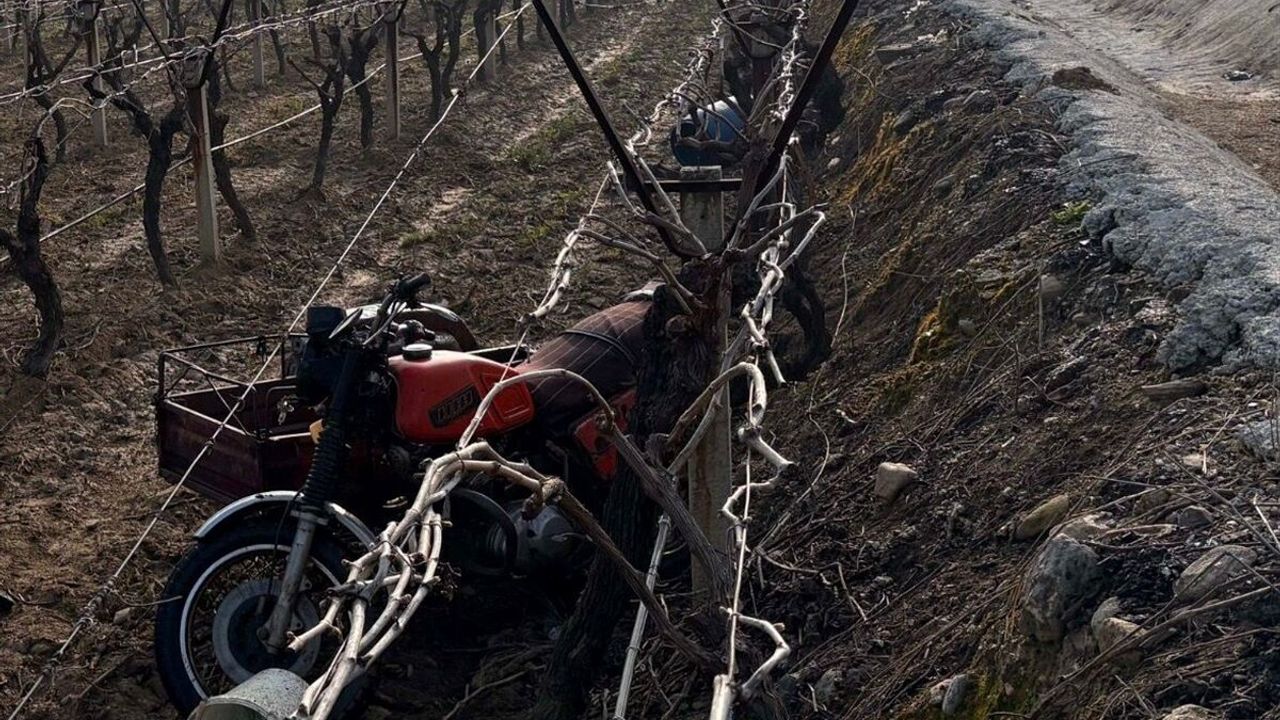 Mehmet Cantürk'ün kullandığı plakasız motosiklet, Köseali Mahallesi'nde henüz belirlenemeyen nedenle yol kenarındaki üzüm bağına devrildi.