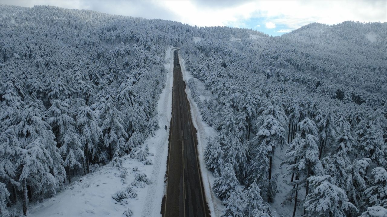 Karla kaplanan çam ormanları ve kıvrılarak uzanan yolların oluşturduğu güzel manzara dron ile görüntülendi.