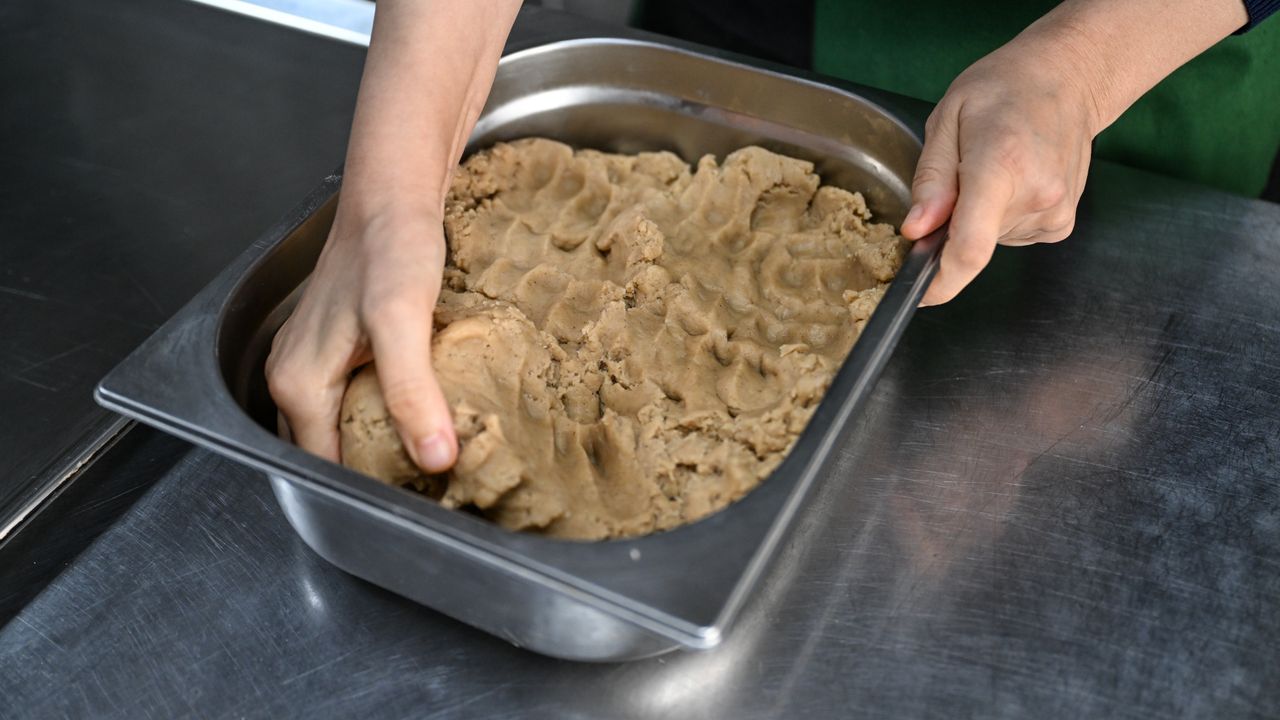 - Susama batırılan hamur, daha sonra geleneksel tahta kalıba yerleştirilir.