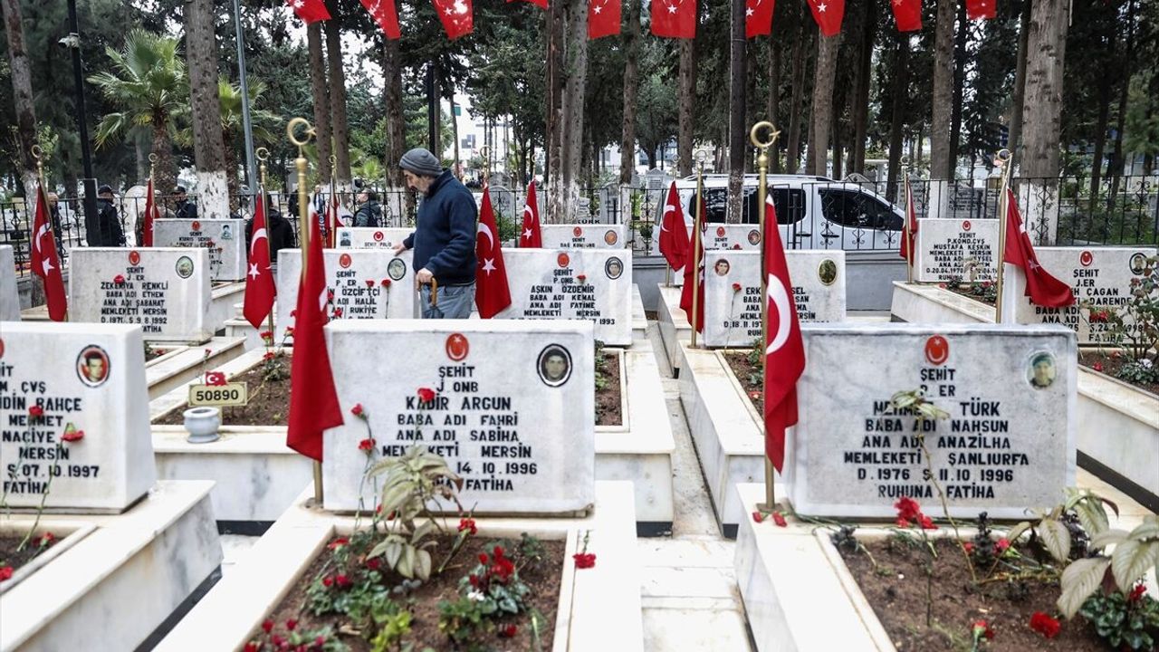 Toroslar ilçesinde Şehir Mezarlığı'ndaki şehitliğe giden aileler, Türk bayraklarıyla donatılmış mezarlara çiçek bıraktı.