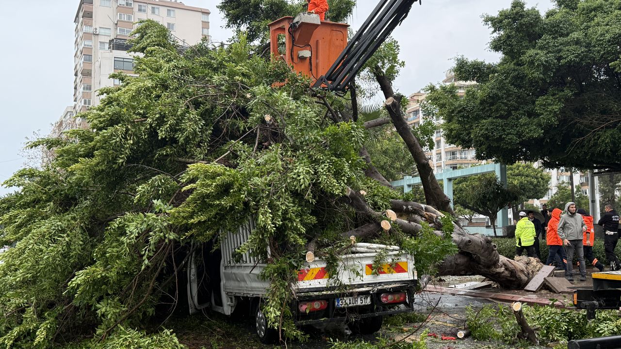 Yoldan geçen 33 AUH 517 plakalı kamyonet, ağacın altında kaldı, dallar da 33 BCY 104 plakalı otomobilin ve 33 M 1055 plakalı yolcu minibüsünün üzerine düştü.