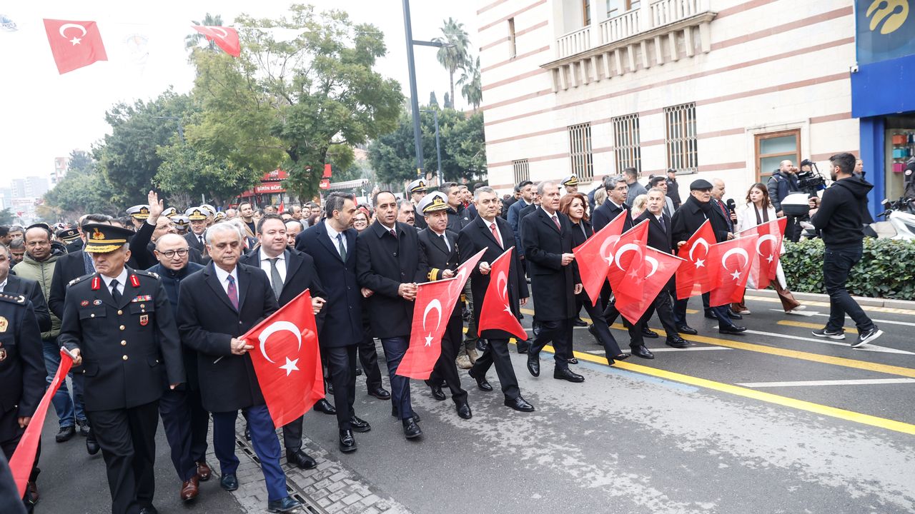 Cumhurbaşkanı Recep Tayyip Erdoğan'ın kutlama mesajının okunduğu törende, Vali Atilla Toros, Tuğamiral Özgür Erken ve Büyükşehir Belediye Başkanı Vahap Seçer araca binip alandaki katılımcıları selamladı, kentin düşman işgalinden kurtuluşunun yıl dönümünü kutladı.