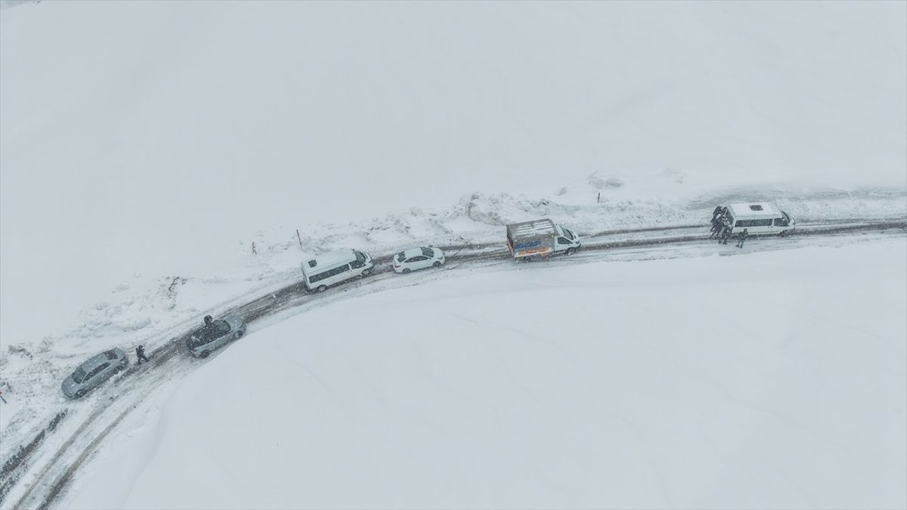 Kara yolunun Kaymakam Çeşmesi yakınında kar ve tipiden dolayı ilerleyemeyen araçlardaki yaklaşık 50 kişi mahsur kaldı.