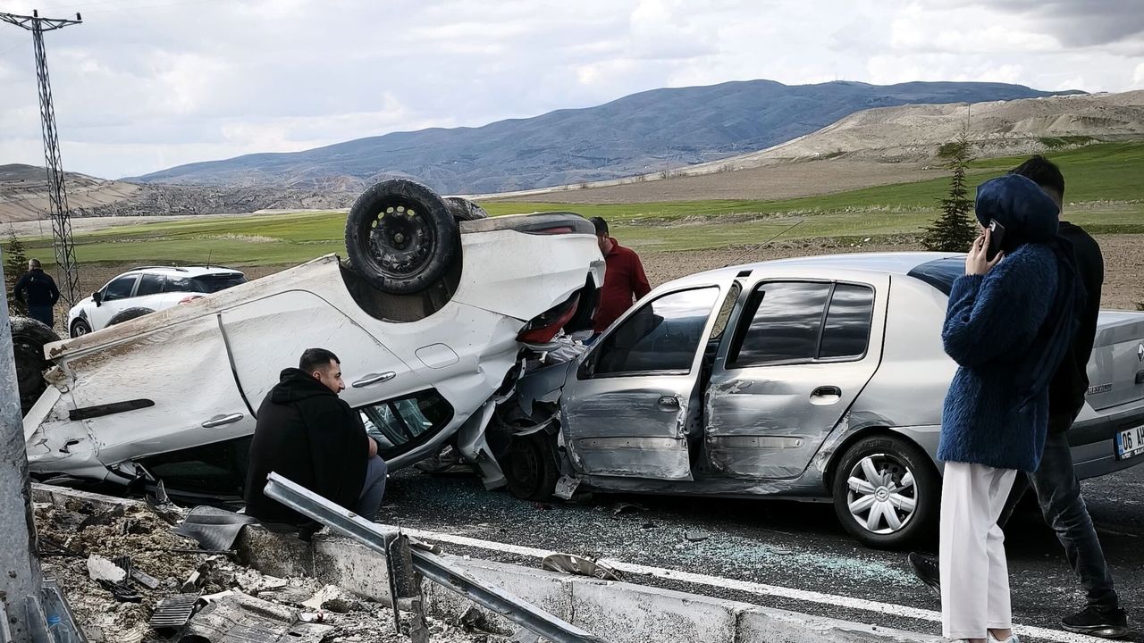 Çarpışmanın etkisiyle savrulan otomobillerden biri refüje çarpıp devrildi.