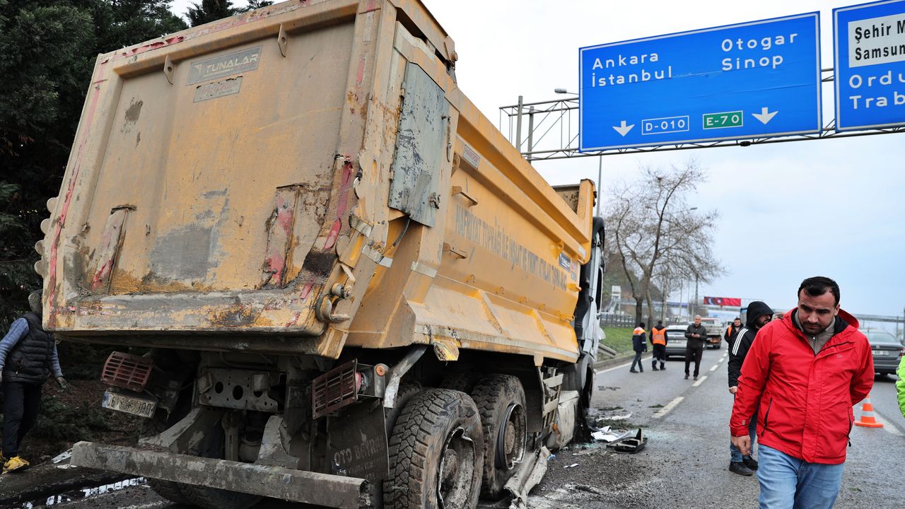 Refüjdeki bariyerlere sıkışan kamyonun kaldırılmasıyla kara yolunda ulaşım normale döndü.