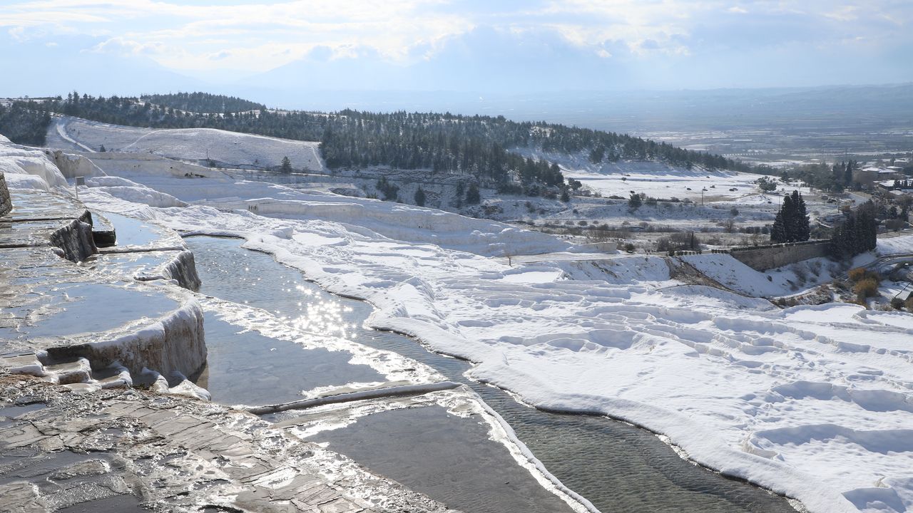 Travertenleri, Hierapolis Antik Kenti, antik havuzu, sıcak hava balonu ve yamaç paraşütü aktiviteleriyle milyonlarca turisti ağırlayan ilçede gece boyunca kar yağışı etkili oldu.