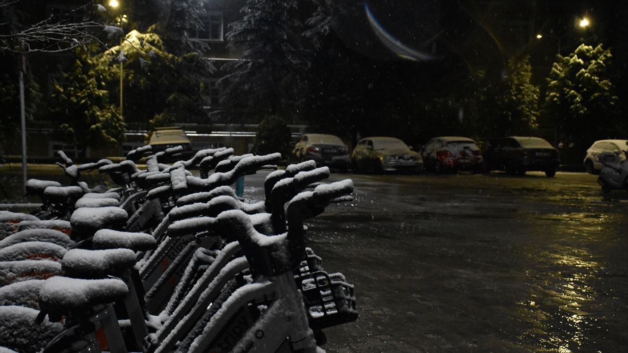 Yağış nedeniyle ağaçlar, banklar, yeşil alanlar ve araçlar üzerinde kar birikintileri oluştu.