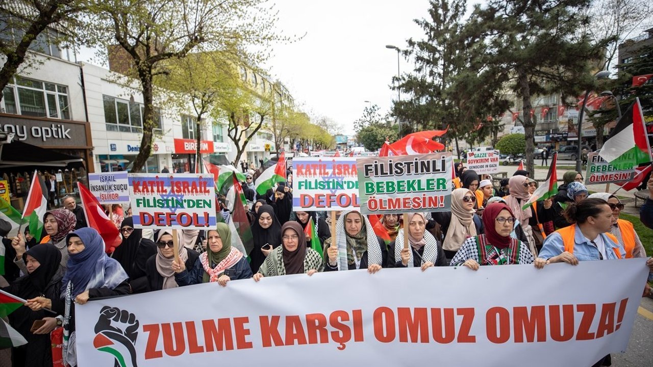 Sakarya İnsan Hak ve Hürriyetleri (İHH) İnsani Yardım Derneği öncülüğünde sivil toplum örgütlerinin desteğiyle Adapazarı ilçesindeki Salko Camisi önünde toplanan grup, ellerindeki dövizlerle Gar Meydanı'na kadar yürüdü.