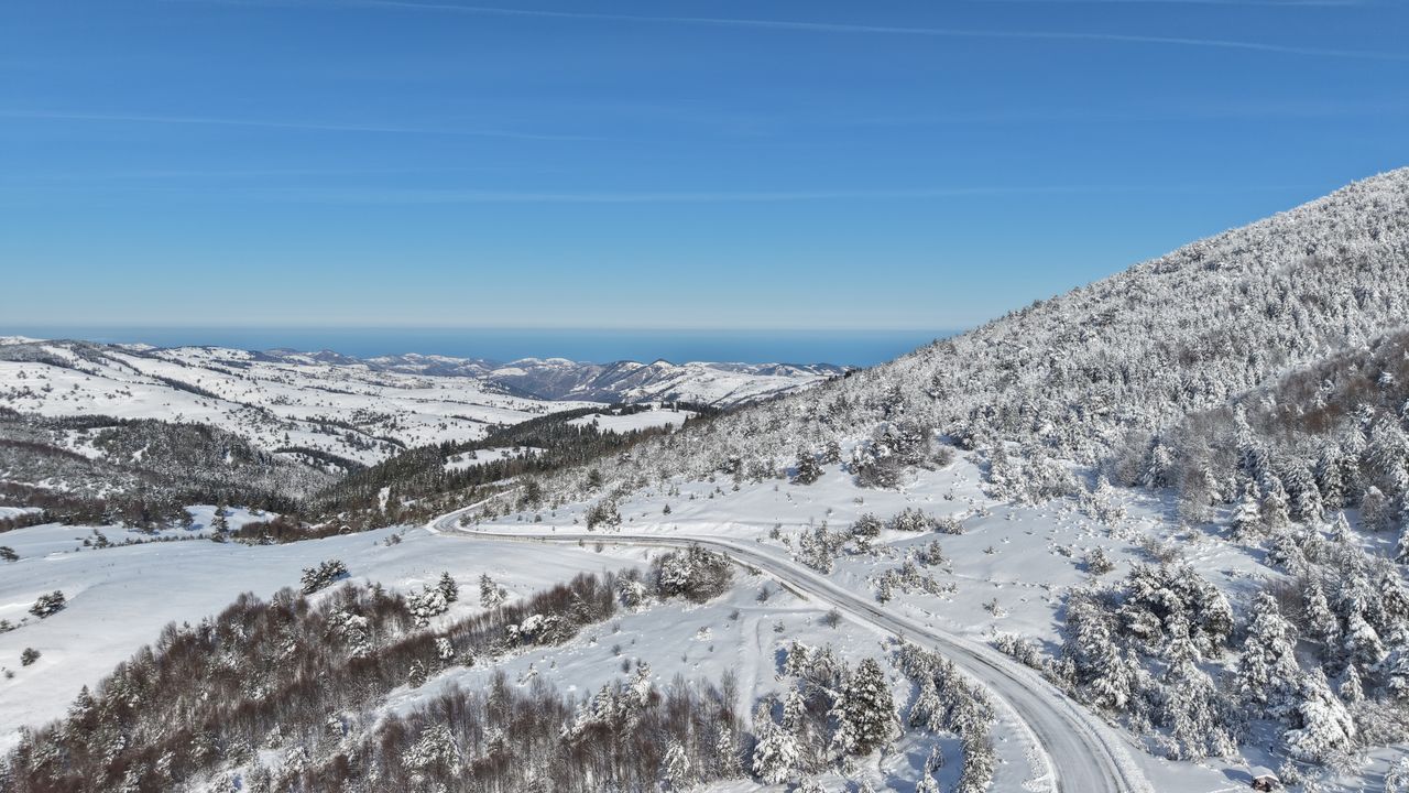 SAMSUN (AA) - Samsun'un Alaçam ilçesine bağlı, 1650 metre rakımlı Dürtmen Dağı'nda etkili olan kar yağışının ardından ortaya çıkan manzaralar, dronla kaydedildi.
