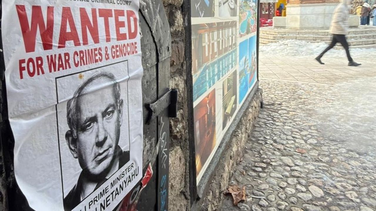 Bir grup insan hakları aktivisti tarafından asılan afişlerde, Netanyahu'nun fotoğrafı yerleştirilerek üzerinde 'Uluslararası Ceza Mahkemesi' yazısı yer alırken, alt kısımda da 'İsrail Başbakanı Binyamin Netanyahu, aranıyor, savaş suçları ve soykırımdan' ifadelerine yer verildi.