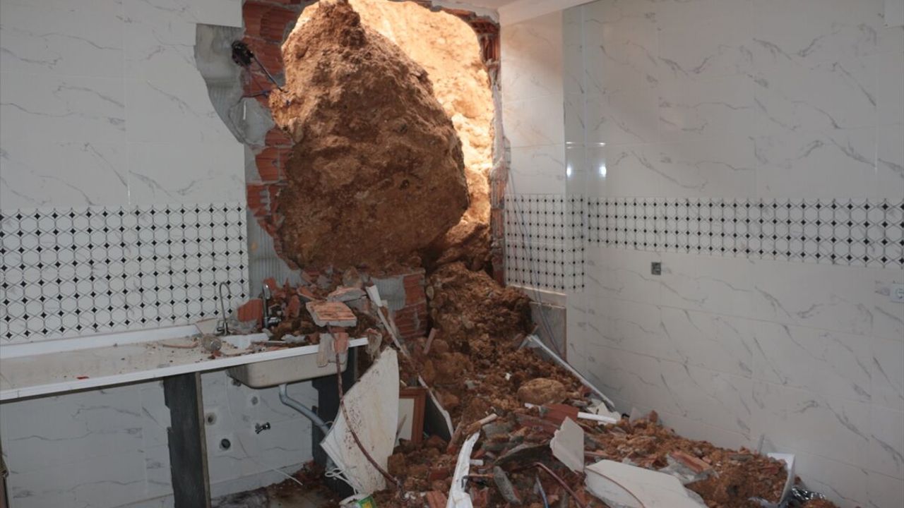 Yamaçtan kopan kaya parçaları ile toprak kütlesinin müstakil bir evin üzerine düşmesi sonucu evin bir bölümünde hasar oluştu.