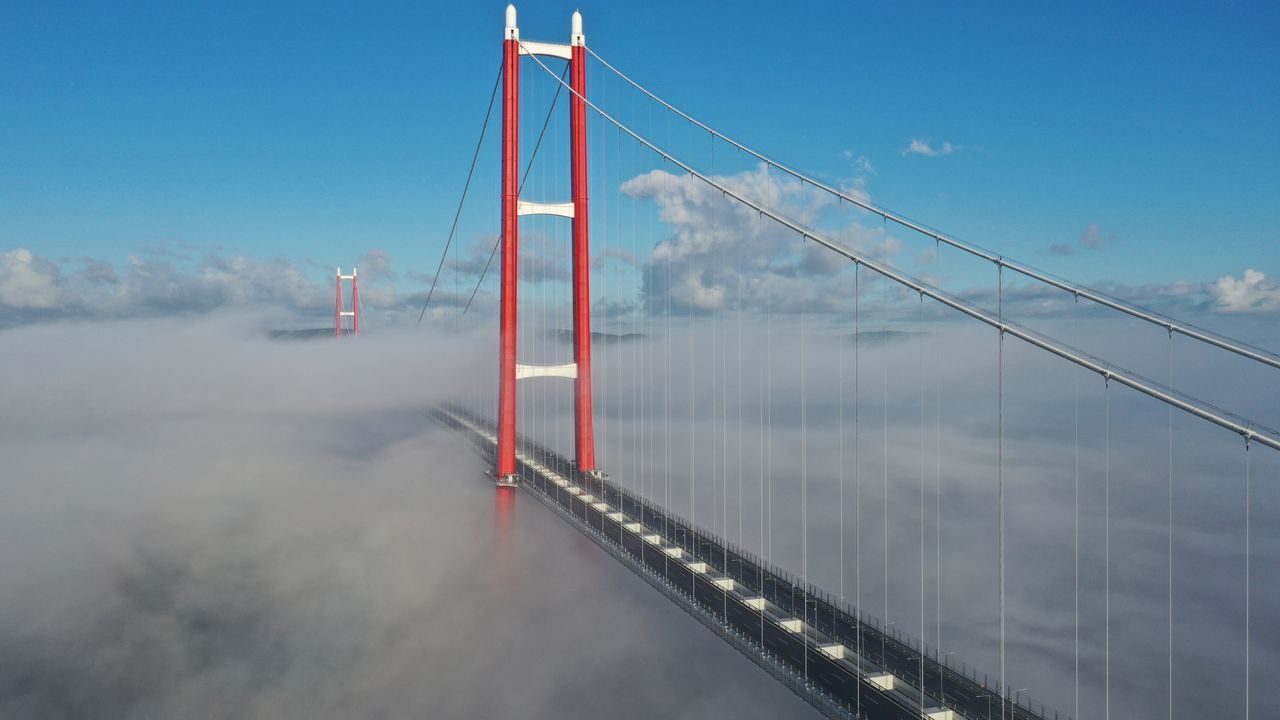 Lapseki ile Gelibolu ilçeleri arasında yer alan köprünün sis bulutuyla bütünleşen manzarası, yaklaşık 500 metre yükseklikten dronla görüntülendi.