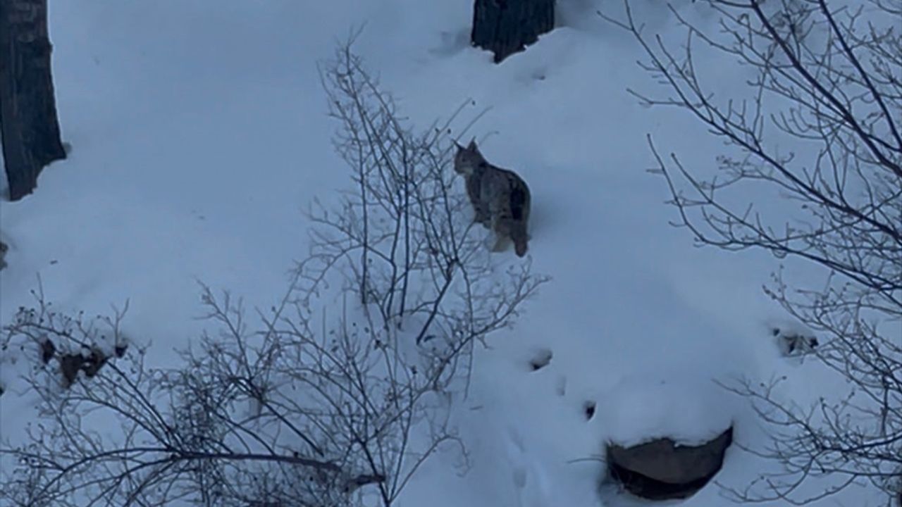 Geminbeli Geçidi Karalar köyü Selimler mezrası yakınlarında karla kaplanan dağlarda yiyecek bulamayan bir vaşak, kara yolu kenarında görüntülendi.