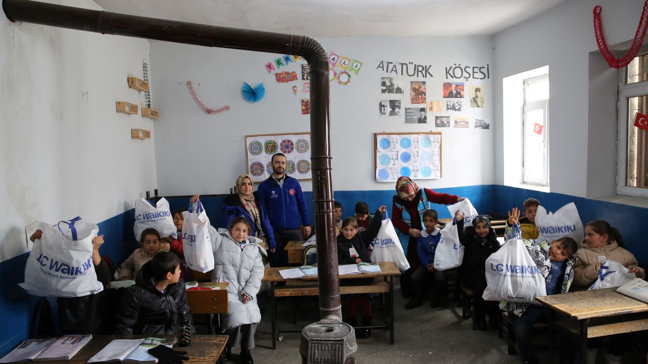 Erzurum'un Köprüköy ilçesinde bulunan köy okullarını ziyaret eden Turan, öğrencilere kışlık kıyafetler ile çeşitli hediyeler dağıttı.