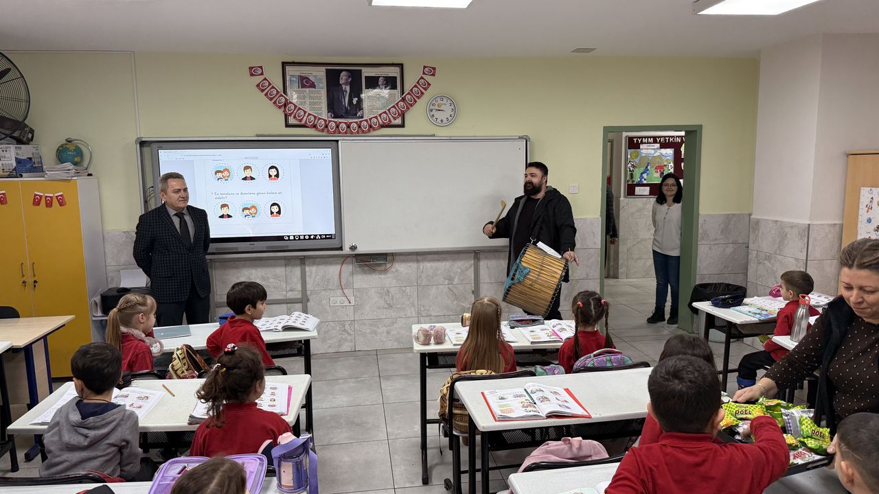 Etkinlikler kapsamında Süleymanpaşa İlkokulu'nda Halk Oyunları Eğitmeni Gürkan Yeşil, sınıflarda davul çalıp öğrencilere mani okudu.