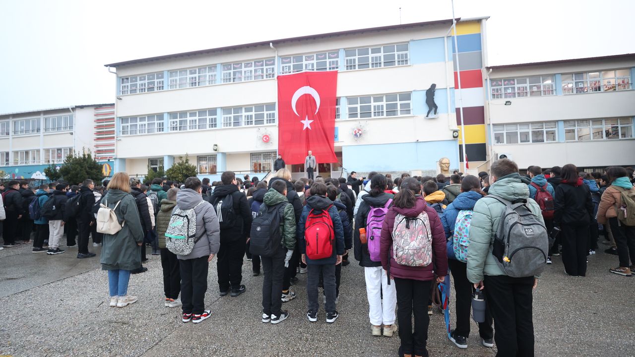 Atatürk Ortaokulu'nda düzenlenen programda öğrenciler, ilk ders başlamadan önce okul bahçesinde sıraya girdi. Ardından 1 dakikalık saygı duruşunda bulunuldu.