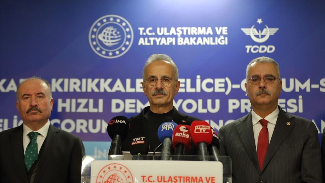 'Delice'den başlayarak Çorum, Merzifon'u da geçip Samsun'a ulaşacak 293 kilometrelik yeni hızlı tren hattının 120 kilometrelik Delice-Çorum kesimini 3 bin personel ve 850 makineyle gece gündüz çalışarak hayata geçiriyoruz. Bugün itibarıyla bu etabımızdaki genel fiziki ilerlememiz yaklaşık yüzde 23 seviyesine ulaşmış durumdadır. Kazı çalışmalarında, 27,61 milyon metreküp kazı yaparak yüzde 87 gerçekleşme sağladık. 8 tünelde toplam 9 bin 507 metrede yaklaşık yüzde 19 ilerleme sağladık. 31 köprüden 13'ünde yapım çalışmalarımızı sürdürüyoruz. Aç-kapa yapılarında, alt ve üst geçitler ile menfezlerde de çalışmalarımıza hız kesmeden devam ediyoruz. 200 kilometre hıza uygun şekilde planlanan bu hattımız tamamlandığında Ankara-Kırıkkale-Çorum arasında kesintisiz hızlı tren bağlantısı sağlanacak ve Çorum-Ankara arası 1 saat 20 dakika olacak.'