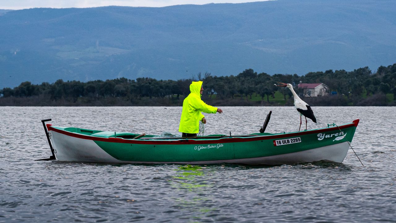Yaren leyleğin, göl manzaralı yuvasının bulunduğu mahallede balıkçı Yılmaz'ın kayığındaki geleneksel pozu, doğa ve yaban hayatı fotoğrafçısı Alper Tüydeş tarafından kayda alındı.