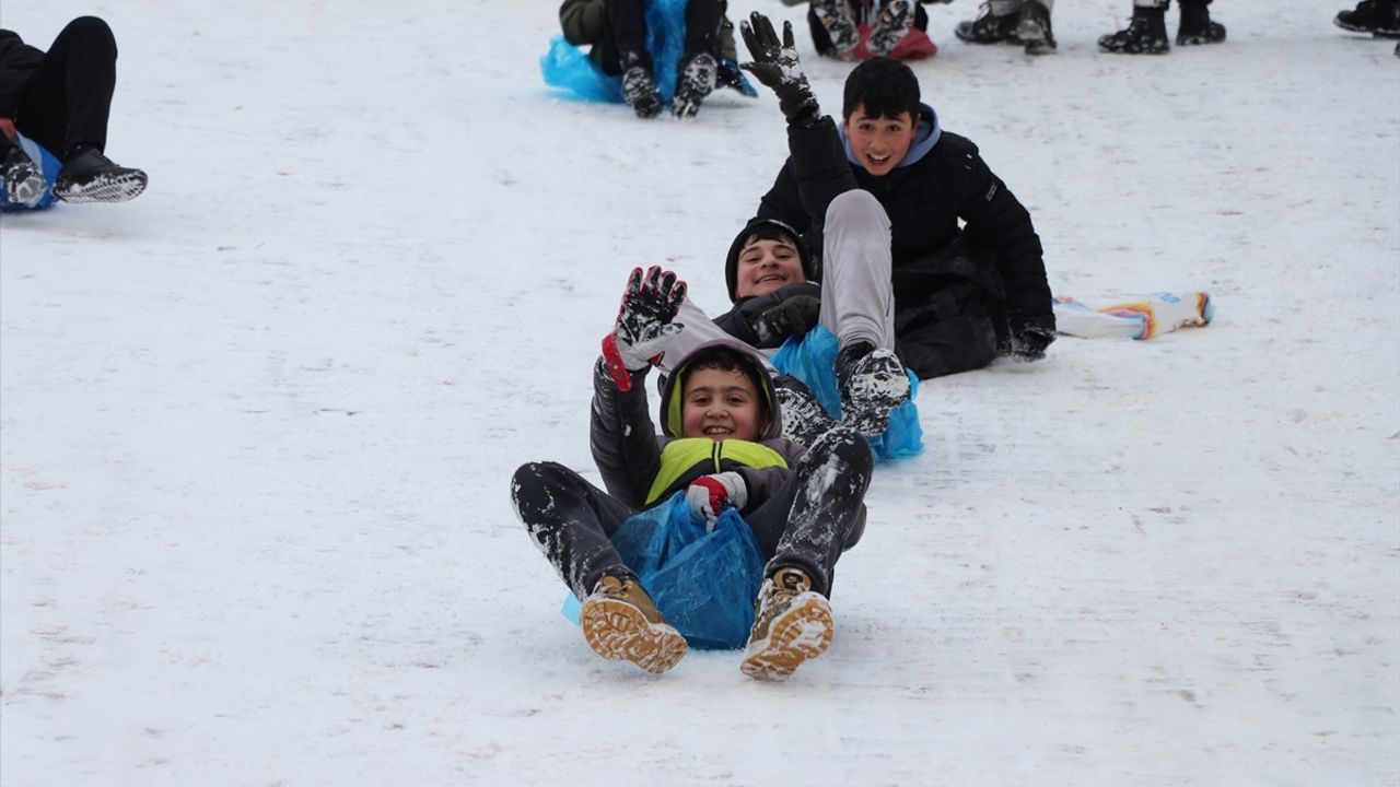 Kentte dün etkili olan kar yağışı nedeniyle eğitime bugün ara verilmesiyle birlikte çocuklar, ellerinde naylon poşet ve tepsilerle mahalle aralarındaki yokuşlarda toplandı.